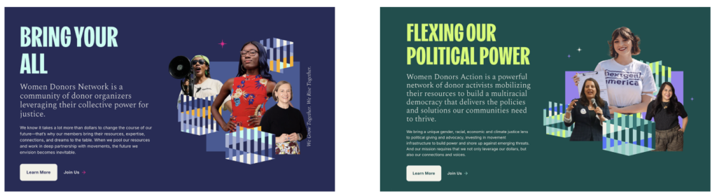 In our new visual identity, you’ll find woven patterns symbolizing connection, plus beautiful imagery that centers our members in action. Bold typography reflecting the weight and urgency of our work pairs with a more delicate font, symbolizing both strength and care. And our new color palettes are anchored in deep green for Women Donors Action and dark blue for Women Donors Network, with pop colors to add energy and emphasis.